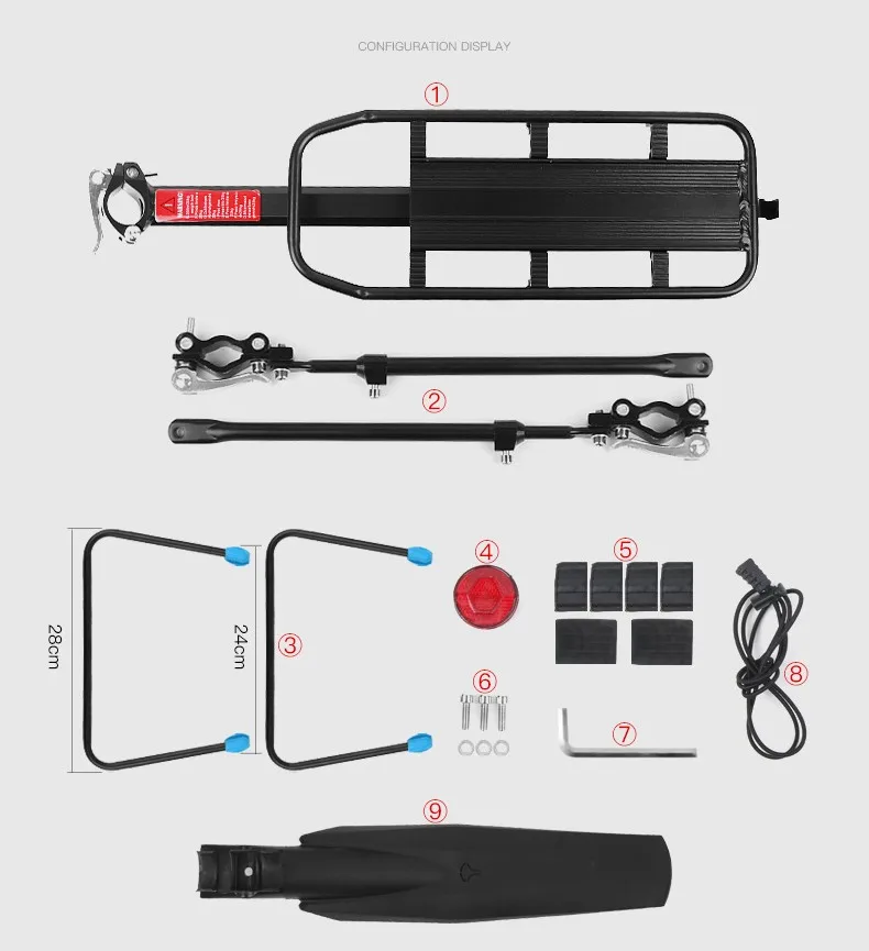 *Quick release mount to seat post, and quick release/screw fix to frame for firm positioning;